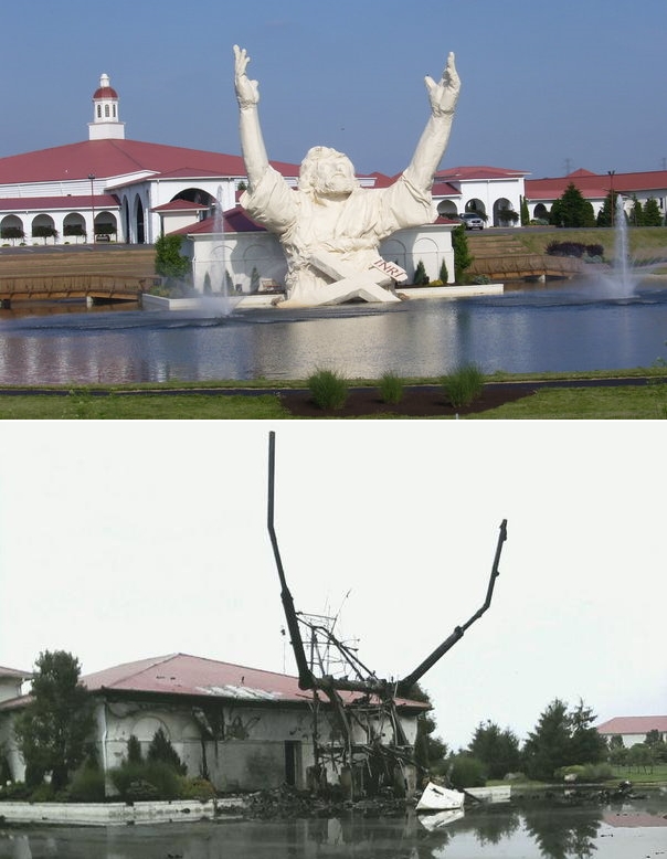 Act Of God of the Day: Solid Rock Church’s landmark 62-foot “Touchdown Jesus” statue (officially known as “King of Kings”) was struck by lightning around 11PM last night and promptly burned to the ground.