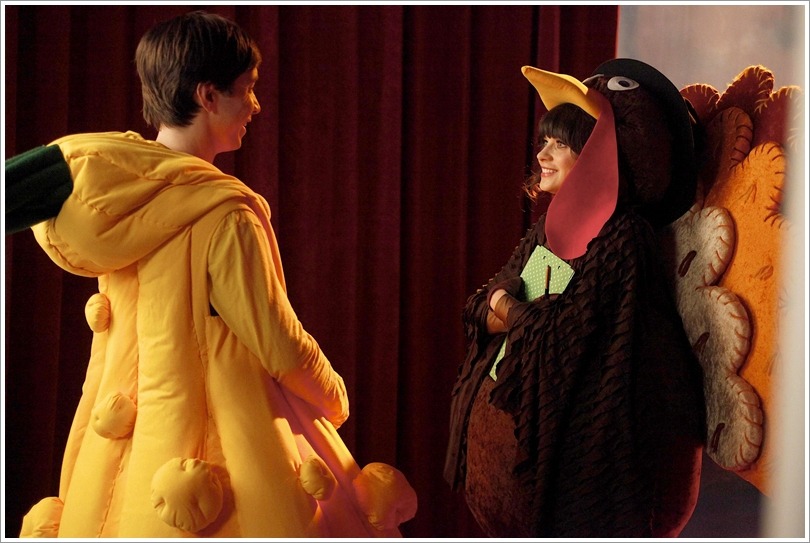 NEW GIRL: Jess (Zooey Deschanel, R) invites her crush Paul (guest star Justin Long, L) to Thanksgiving dinner in the “Thanksgiving” episode of NEW GIRL airing Tuesday, Nov. 15 (9:01-9:31 PM ET/PT) on FOX. ©2011 Fox Broadcasting Co. Cr: Greg Gayne/FOX ©2011 Fox Broadcasting Co. Cr: Greg Gayne/FOX