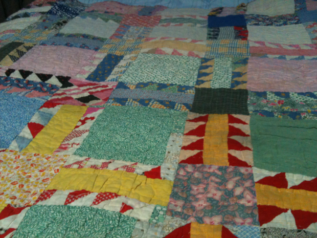 Every night since my grandmother passed away in 2005 that I have slept in my own bed, I have used this quilt. Clearly, she was no master quilter…the colors don’t match, the pieces are cut at different lengths, and when you hold it up it has a vague trapezoid shape, and this is the pretty side. There are those quilts that are fluffy and soft, this is not that. This is clearly a depression era quilt, it’s sole purpose is warmth and it’s primary way of delivering that warmth is through weight, it’s heavier than you’d think. When my grandmother passed away, my brother and I (who had the rare privilege of siblings to attend the same college and experience that together), packed up and made the 8 hour drive to Indianapolis. While helping our father and uncles clean out the house, we found rare things, but these quilts are something that Brian and I both immediately thought would be worth saving and I think he still has his somewhere. We made awkward jokes about the hideousness of them and mocked the weight, but only because that’s what we do when we are coping.
