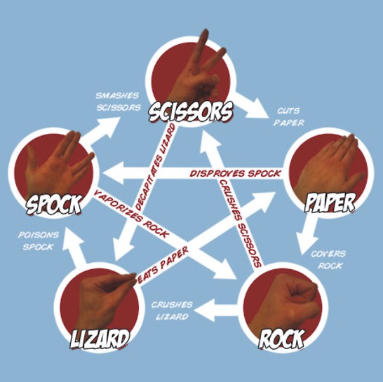 Venkman, geektyrant.comHere’s a diagram for a reinvention of the classic game Rock, Paper, Scissors. Spock and Lizard have now been added to the mix of hand weapons that you can chose from to do battle with. This is how I’ll be play the game from now on as it…
